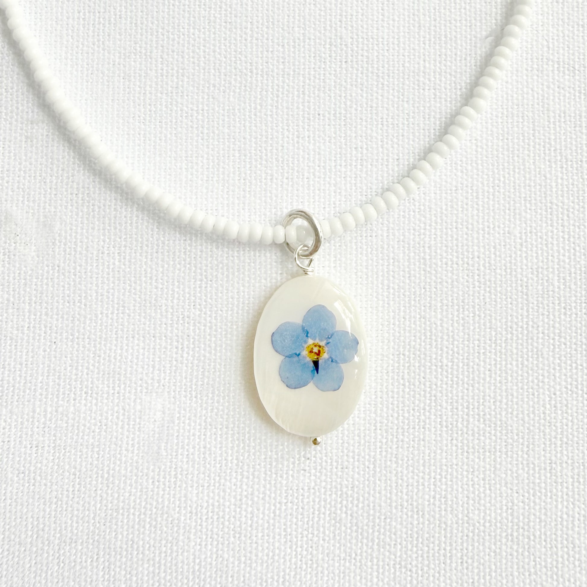 - Handmade mother of pearl pendant with real forget-me-not from Tasmania